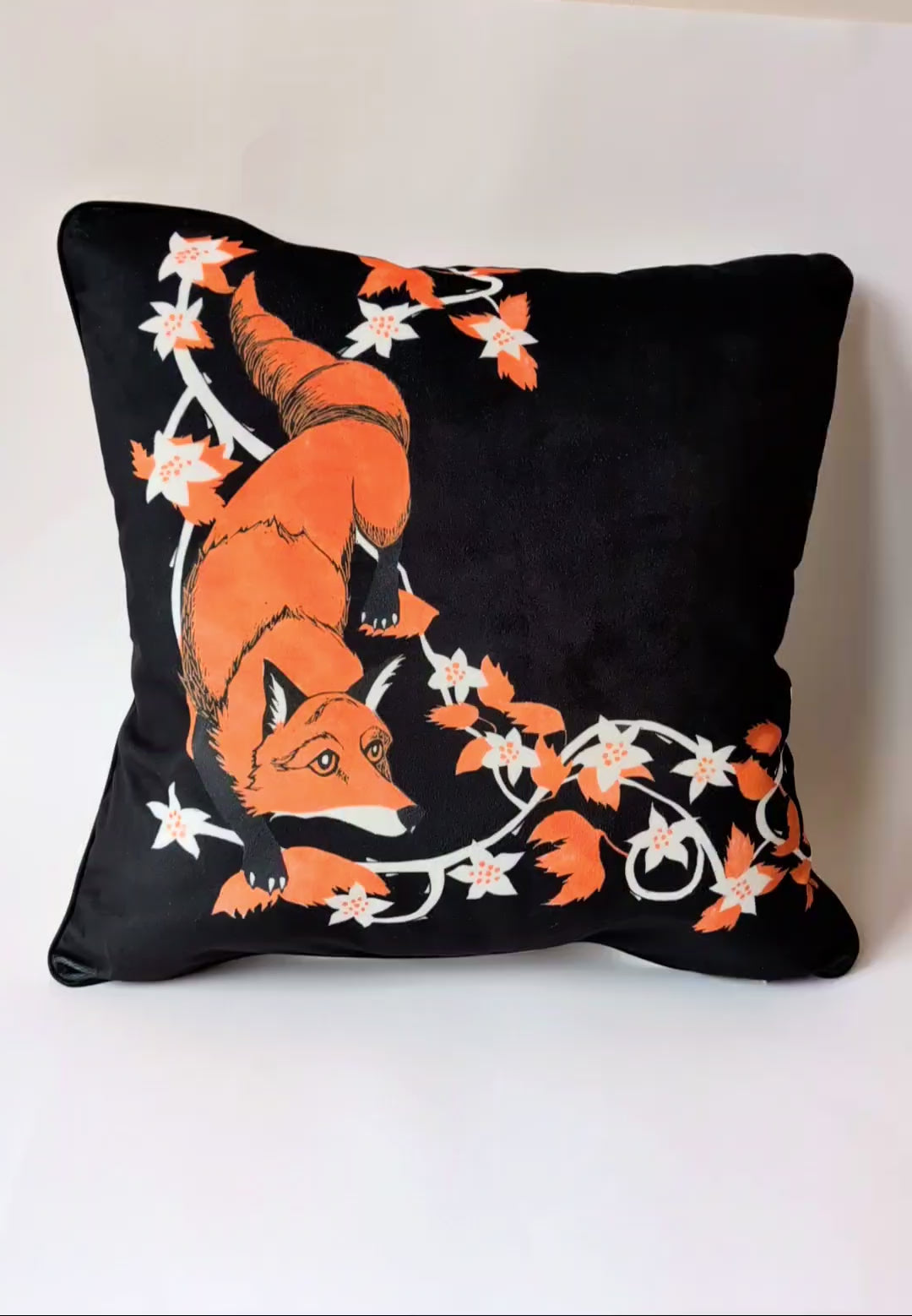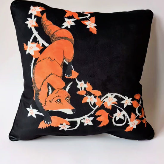 This sumptuous cushion features a fox and bramble design created by Scottish artist and printmaker Marliese Richmond. The striking black, orange and white design is based on her handmade linocut, which is accurately replicated on this cushion. This cushion would be a wonderful way of bringing a piece of unique artwork into your home.
